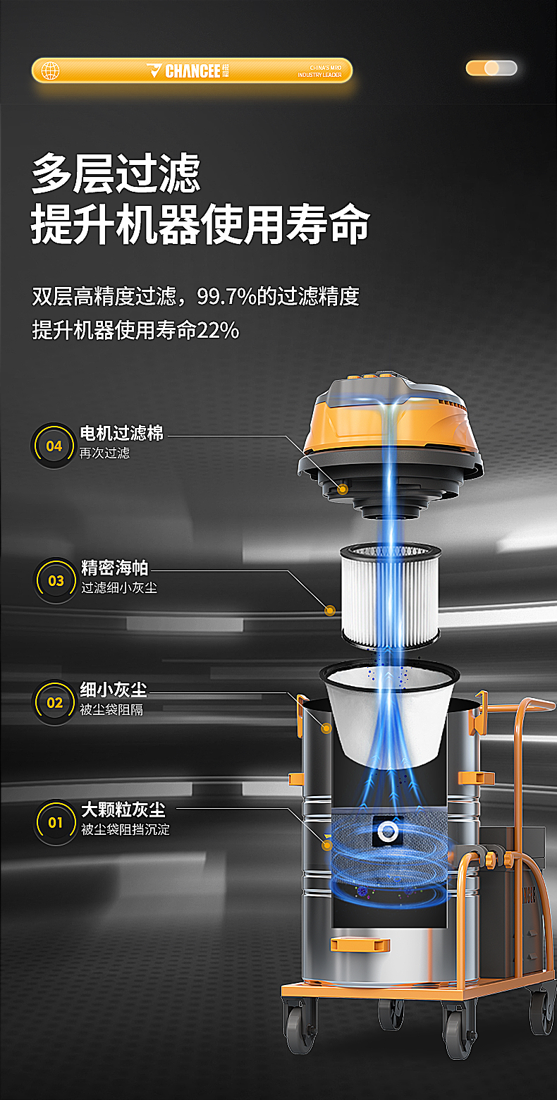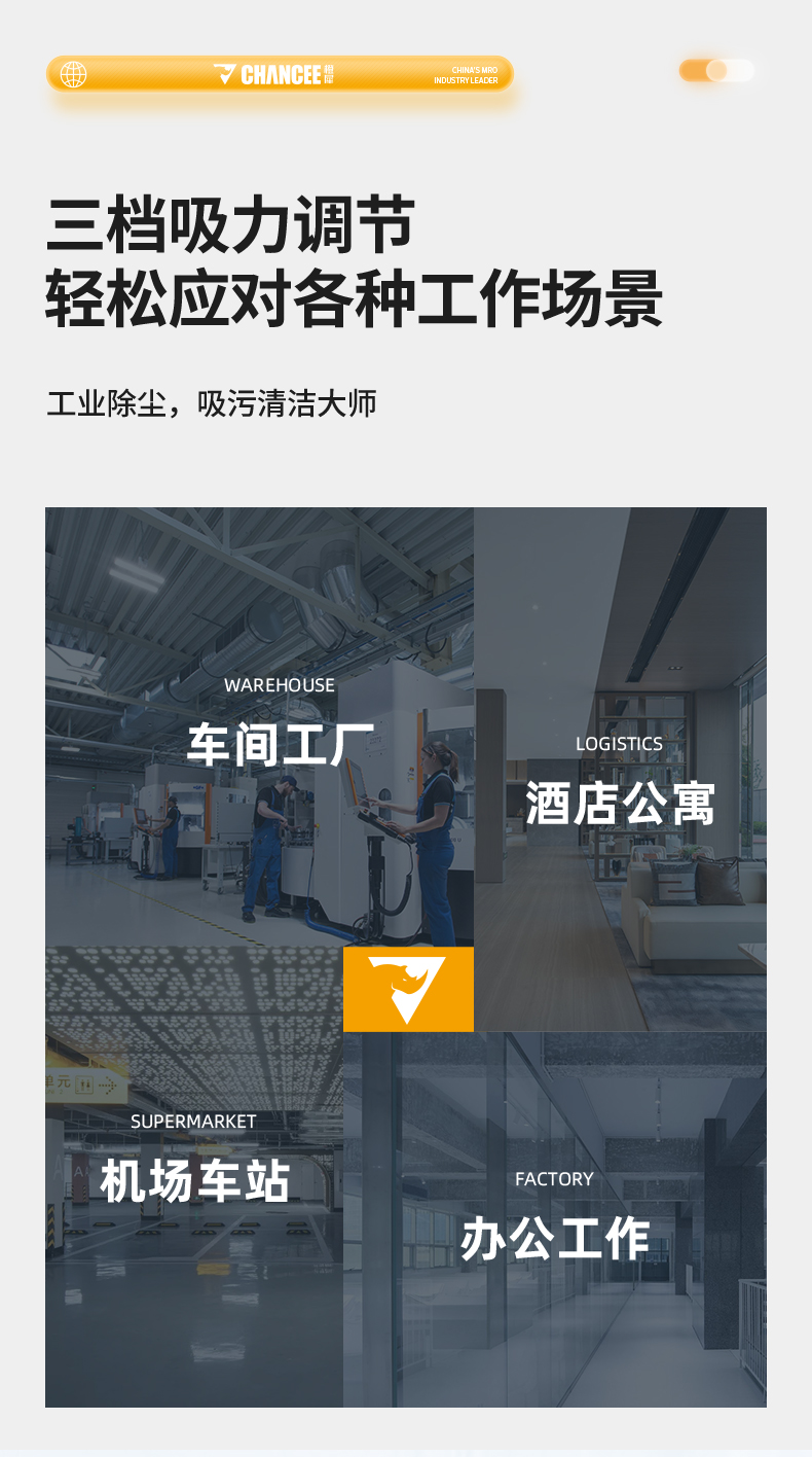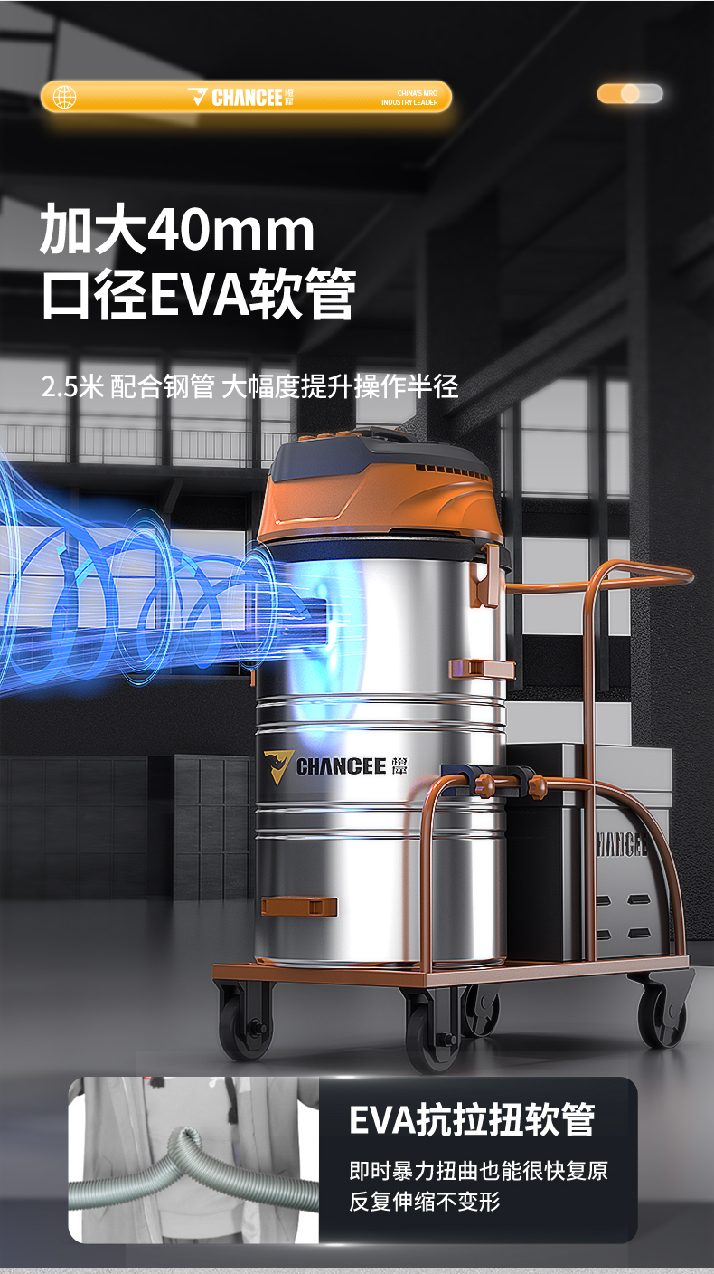 橙犀工業吸塵器:吸水吸塵多功能,3擋隨意切換,灰塵廢料一機搞定,多場景使用,無線無拘無束。大功率吸塵清潔更高效。