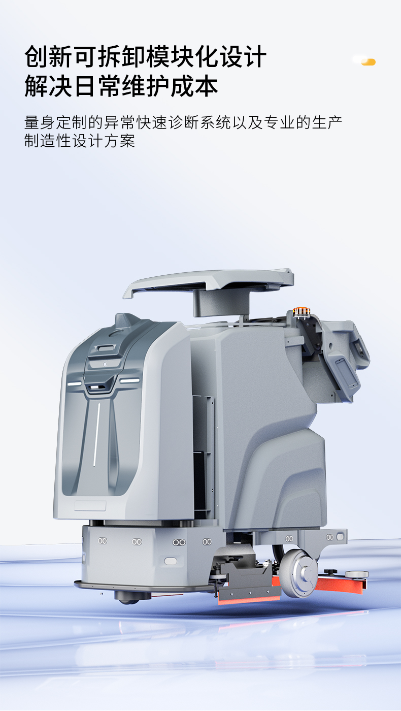 橙犀靈犀1號 無人式洗地機 :靈犀1號擁有最佳通過性,身寬58cm,整機的重量最輕,凈重在200kg以內,新技術加持,三維成像,不同場景可以快速建圖使用。可以使用新廣角3D TOF模組,全智能導航。